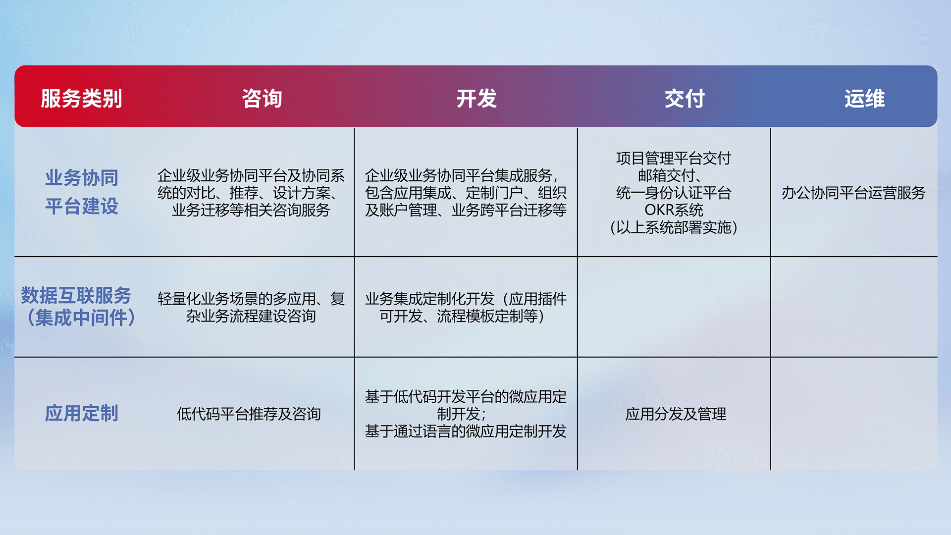 针对钉钉、、企微、、IDaas等平台级产品提供产品的规划、、方案、、、、交付、、、定制化开发等服务,,,,实现如统一协同办公、、智能客户服务、、、、混合会议管理、、、、智能数据查询、、、等业务场景,,,,实现数字化转型。。